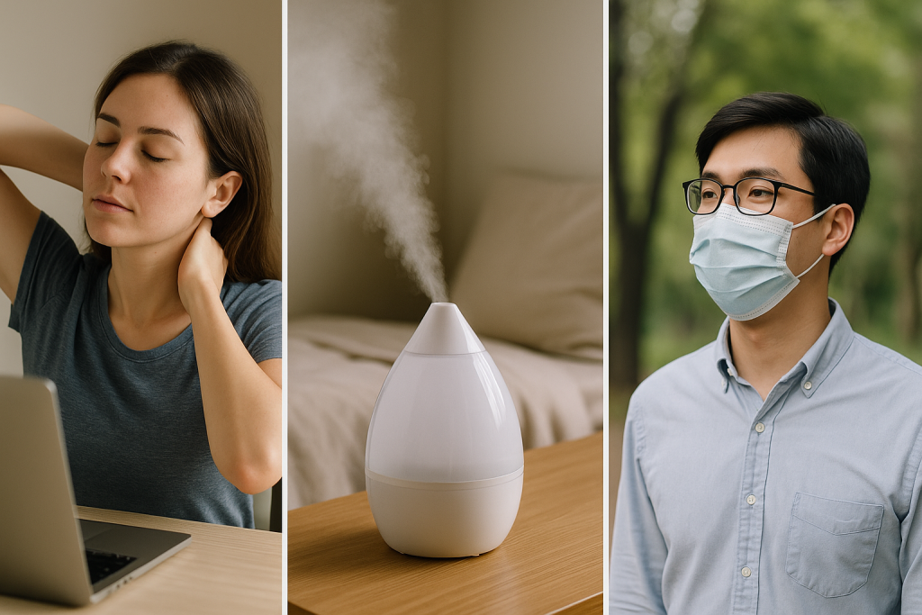 - ドライアイ: PC作業が多い、エアコンの効いた部屋にいる、コンタクトレンズを使っている…などが原因かも。意識的にまばたきを増やしたり、休憩をとったり、加湿器を使ったりしてみましょう。